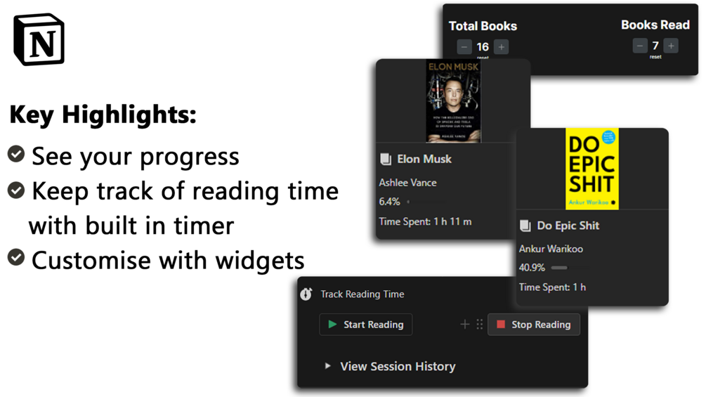 - Note-taking system to store and organize notes from each book and revisit them quickly.